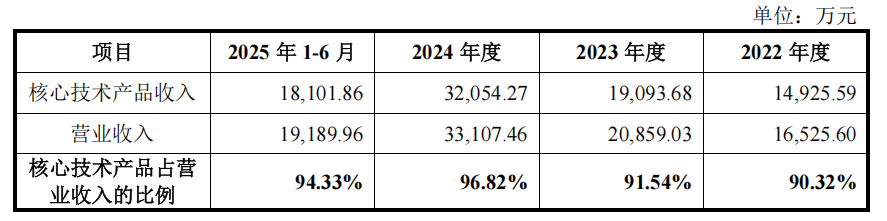 招股书显示,公司核心技术应用于芯片测试接口和探针卡,报告期内公司的核心技术产品收入占整体营收的90.32%、91.54%、96.82%、94.33%。
