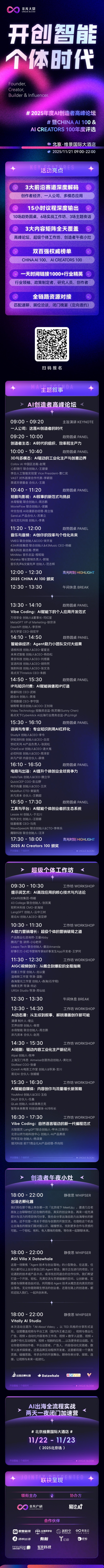 这将是一次从「看见趋势」到「写出计划」再到「找到伙伴」的三日旅程:11月21日在高峰论坛看见创造者与Agent的时代图景,22–23日在加速营里,把你自己的出海剧本完整搭起来。